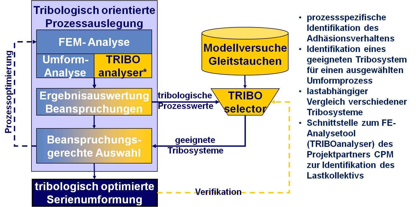 Inhalt der aktuellen Forschung ist eine Erweiterung zum TRIBOprocess-Tool, das auf Basis thermischer Prozessanalyse das tribologische Verhalten über der Prozessdauer prognostiziert, da sich hier die wesentliche Einflussgröße Prozesstemperatur verändert. Das Tool soll zum einen die temperaturabhängige Entwicklung der Reibung über dem Prozessverlauf prognostizieren. Zum anderen sollen über die empirisch ermittelten Adhäsionsgrenzen Aussagen über die Prozessfähigkeit getroffen werden.